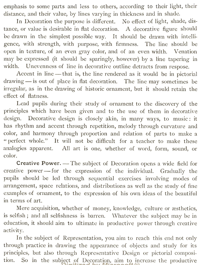 power of the pupils, not only through a study of Historic Ornament for its beauty and for the elements that go to make up that beauty, but also through exercises Decorative Design. Thus creative activity, stimulated and enriched by the study of the beautiful in ornament, will ultimate in productive power.