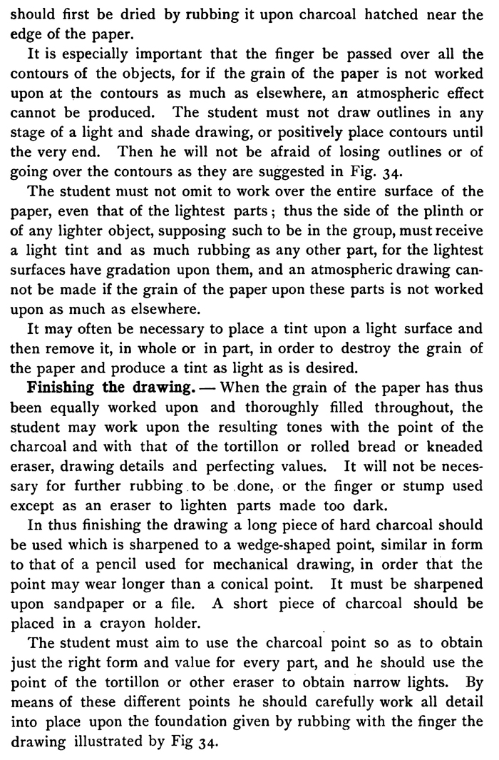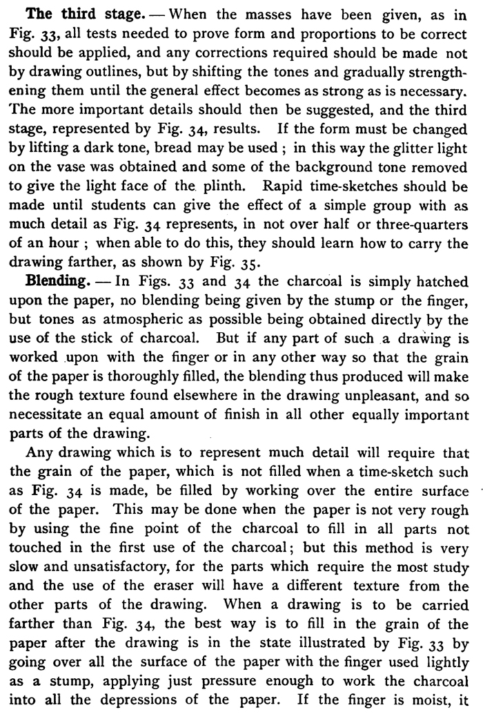 Any drawing which is to represent much detail will require that the grain of the paper, which is not filled when a time-sketch such as Fig. 34 is made, be filled by working over the entire surface of the paper. This may be done when the paper is not very rough by using the fine point of the charcoal to fill in all parts not touched in the first use of the charcoal ; but this method is very slow and unsatisfactory, for the parts which require the most study and the use of the eraser will have a different texture from the other parts of the drawing. When a drawing is to be carried farther than Fig. 34, the best way is to fill in the grain of the paper after the drawing is in the state illustrated by Fig. 33 by going over all the surface of the paper with the finger used lightly as a stump, applying just pressure enough to work the charcoal into all the depressions of the paper. If the finger is moist, it