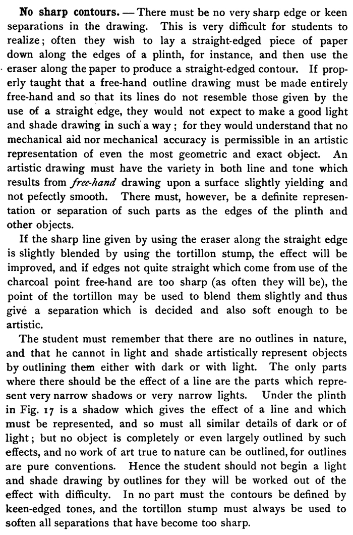 If the sharp line given by using the eraser along the straight edge is slightly blended by using the tortillon stump, the effect will be improved, and if edges not quite straight which come from use of the charcoal point free-hand are too sharp (as often they will be), the point of the tortillon may be used to blend them slightly and thus give a separation which is decided and also soft enough to be artistic. The student must remember that there are no outlines in nature, and that he cannot in light and shade artistically represent objects by outlining them either with dark or with light. The only parts where there should be the effect of a line are the parts which represent very narrow shadows or very narrow lights. Under the plinth in Fig. 17 is a shadow which gives the effect of a line and which must be represented, and so must all similar details of dark or of light ; but no object is completely or even largely outlined by such effects, and no work of art true to nature can be outlined, for outlines are pure conventions. Hence the student should not begin a light and shade drawing by outlines for they will be worked out of the effect with difficulty. In no part must the contours be defined by keen-edged tones, and the tortillon stump must always be used to soften all separations that have become too sharp.