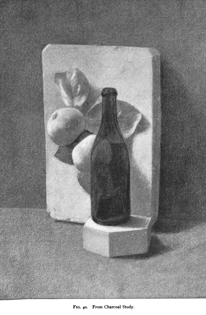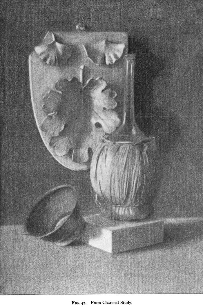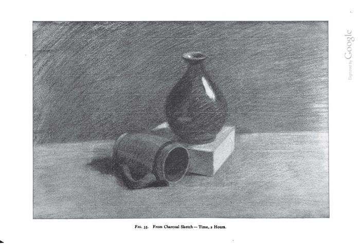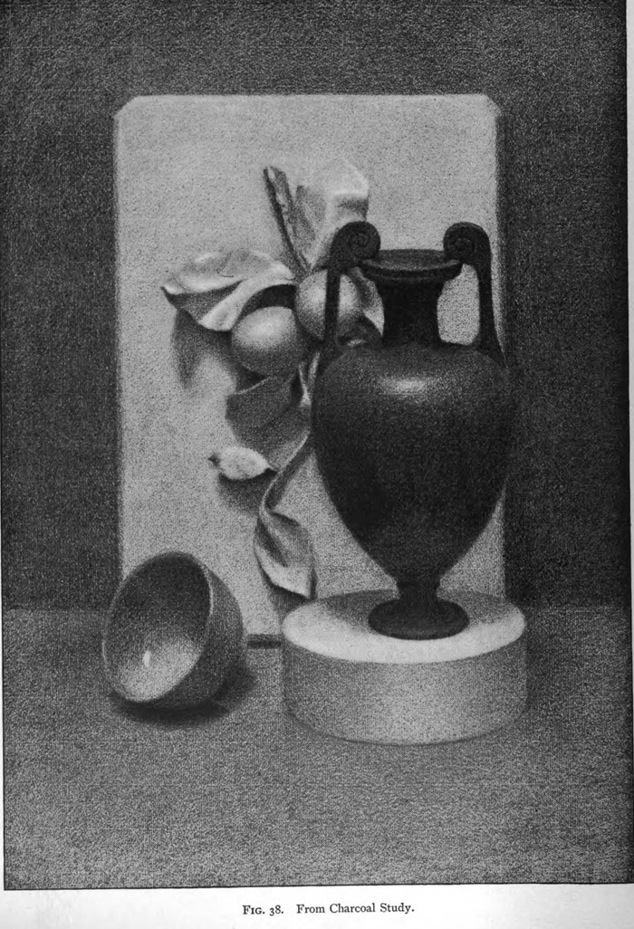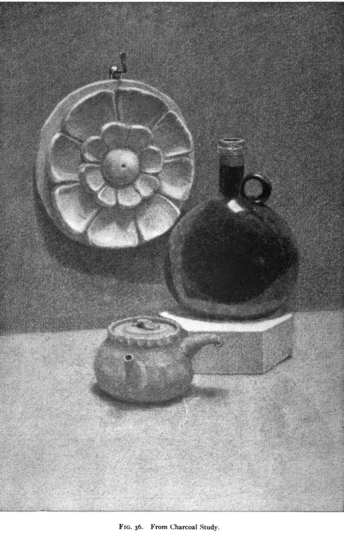 When the masses have been given, as in Fig. 33, all tests needed to prove form and proportions to be correct should be applied, and any corrections required should be made not by drawing outlines, but by shifting the tones and gradually strengthening them until the general effect becomes as strong as is necessary. The more important details should then be suggested, and the third stage, represented by Fig. 34, results. If the form must be changed by lifting a dark tone, bread may be used ; in this way the glitter light on the vase was obtained and some of the background tone removed to give the light face of the plinth. Rapid time-sketches should be made until students can give the effect of a simple group with as much detail as Fig. 34 represents, in not over half or three-quarters of an hour ; when able to do this, they should learn how to carry the drawing farther, as shown by Fig. 35.