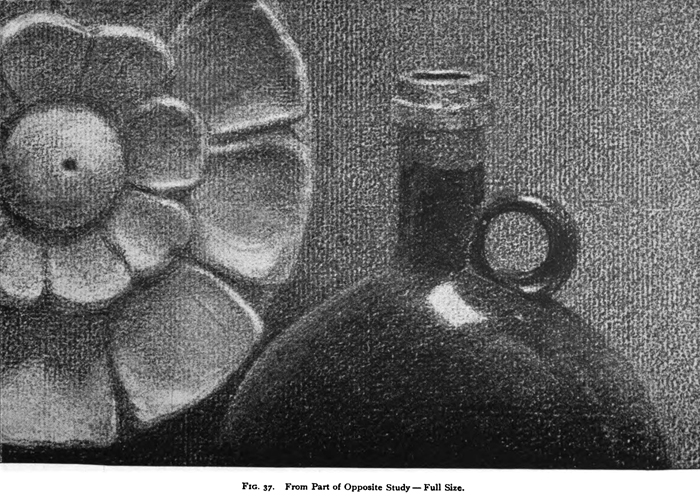 Fig. 37 gives, full size, a part of the rosette and bottle of Fig 36, and shows the texture produced by working as explained. To produce the best effect of atmosphere the grain of the paper should show about as strongly as in this figure. It is not necessary to completely work out the watermarks of the parallel lines unless they come in parts where much fine detail is to be represented.