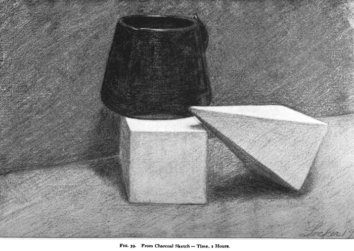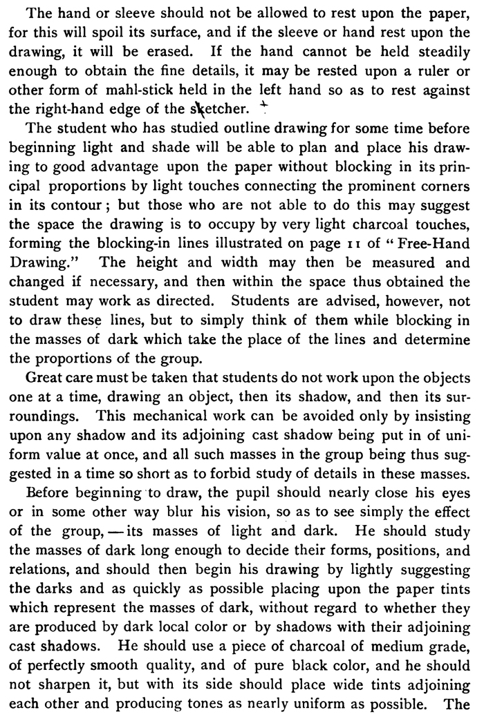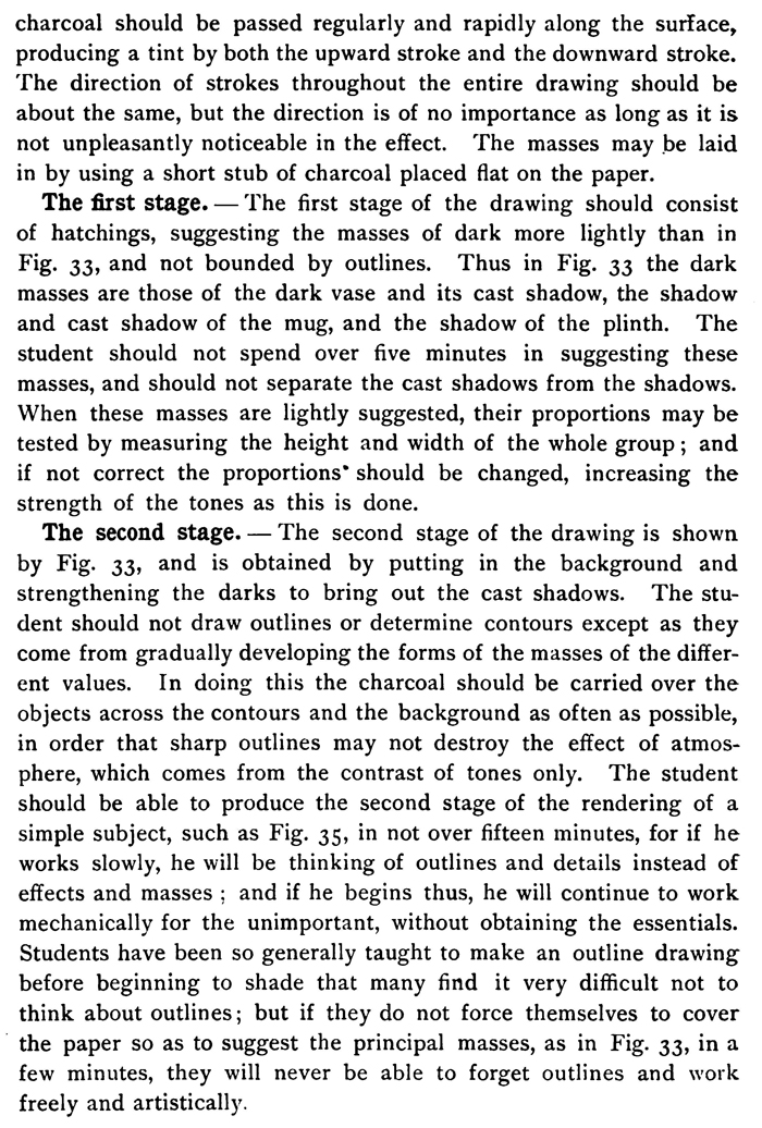 Before beginning to draw, the pupil should nearly close his eyes or in some other way blur his vision, so as to see simply the effect of the group, — its masses of light and dark. He should study the masses of dark long enough to decide their forms, positions, and relations, and should then begin his drawing by lightly suggesting the darks and as quickly as possible placing upon the paper tints which represent the masses of dark, without regard to whether they are produced by dark local color or by shadows with their adjoining cast shadows. He should use a piece of charcoal of medium grade, of perfectly smooth quality, and of pure black color, and he should not sharpen it, but with its side should place wide tints adjoining each other and producing tones as nearly uniform as possible. The charcoal should be passed regularly and rapidly along the surface, producing a tint by both the upward stroke and the downward stroke. The direction of strokes throughout the entire drawing should be about the same, but the direction is of no importance as long as it is not unpleasantly noticeable in the effect. The masses may be laid in by using a short stub of charcoal placed flat on the paper.