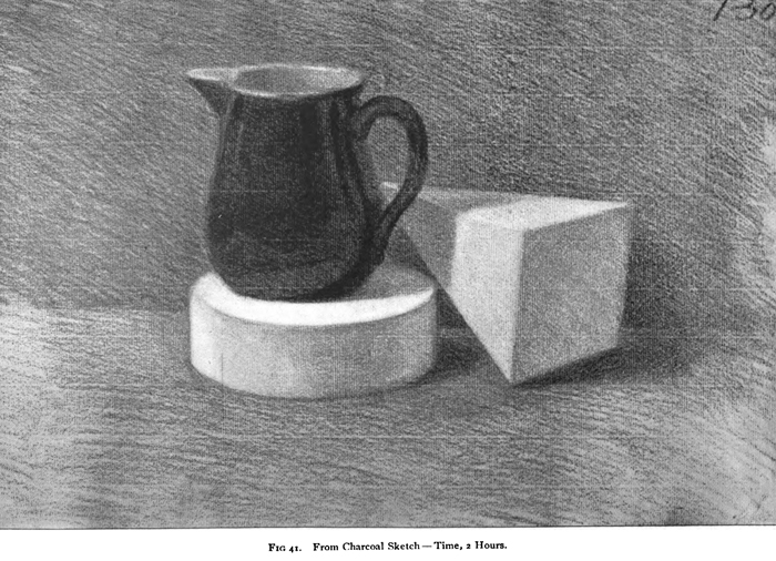 Great care must be taken that students do not work upon the objects one at a time, drawing an object, then its shadow, and then its surroundings. This mechanical work can be avoided only by insisting upon any shadow and its adjoining cast shadow being put in of uniform value at once, and all such masses in the group being thus suggested in a time so short as to forbid study of details in these masses.