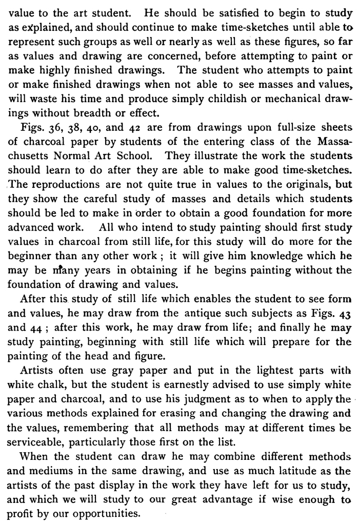 Figs. 35, 39, and 41 are from two-hour time-sketches by first-year art-school students ; they illustrate the work which is of greatest value to the art student. He should be satisfied to begin to study as explained, and should continue to make time-sketches until able to represent such groups as well or nearly as well as these figures, so far as values and drawing are concerned, before attempting to paint or make highly finished drawings. The student who attempts to paint or make finished drawings when not able to see masses and values, will waste his time and produce simply childish or mechanical drawings without breadth or effect.