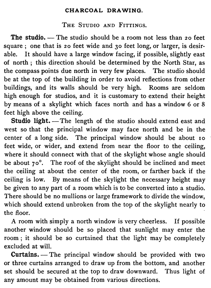 The length of the studio should extend east and west so that the principal window may face north and be in the center of a long side. The principal window should be about to feet wide, or wider, and extend from near the floor to the ceiling, where it should connect with that of the skylight whose angle should be about 70°. The roof of the skylight should be inclined and meet the ceiling at about the center of the room, or farther back if the ceiling is low. By means of the skylight the necessary height may be given to any part of a room which is to be converted into a studio. There should be no mullions or large framework to divide the window, which should extend unbroken from the top of the skylight nearly to the floor. A room with simply a north window is very cheerless. If possible another window should be so placed that sunlight may enter the room ; it should be so curtained that the light may be completely excluded at will.