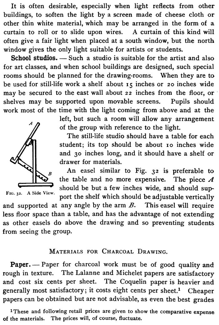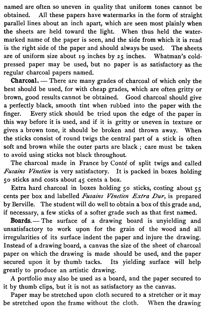 Paper for charcoal work must be of good quality and rough in texture. The Lalanne and Michelet papers are satisfactory and cost six cents per sheet. The Coquelin paper is heavier and generally most satisfactory; it costs eight cents per sheet. Cheaper papers can be obtained but are not advisable, as even the best grades 'These and following retail prices are given to show the comparative expense of the materials. The prices will, of course, fluctuate.