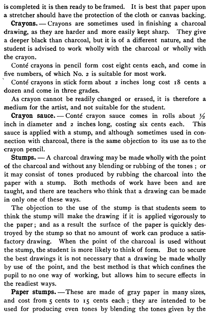 Crayons are sometimes used in finishing a charcoal drawing, as they are harder and more easily kept sharp. They give a deeper black than charcoal, but it is of a different nature, and the student is advised to work wholly with the charcoal or wholly with the crayon. Conte crayons in pencil form cost eight cents each, and come in five numbers, of which No. 2 is suitable for most work. Conte crayons in stick form about z inches long cost 18 cents a dozen and come in three grades. As crayon cannot be readily changed or erased, it is therefore a medium for the artist, and not suitable for the student.