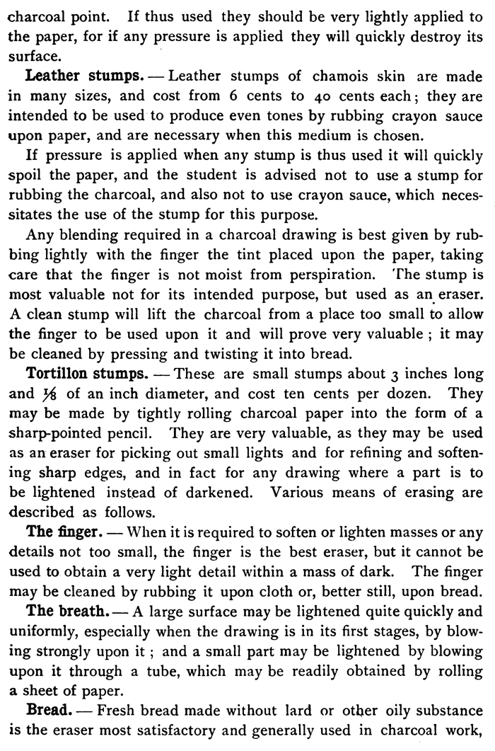 Fresh bread made without lard or other oily substance is the eraser most satisfactory and generally used in charcoal work, as it will quickly remove the charcoal from the paper without the slightest injury to its surface. It may be rolled into pointed stump-like pieces, by which small lights may be taken out, and it is preferable to a sharp-pointed eraser because it does not indent the paper and because it produces a light which is not too keen-edged for artistic drawings.