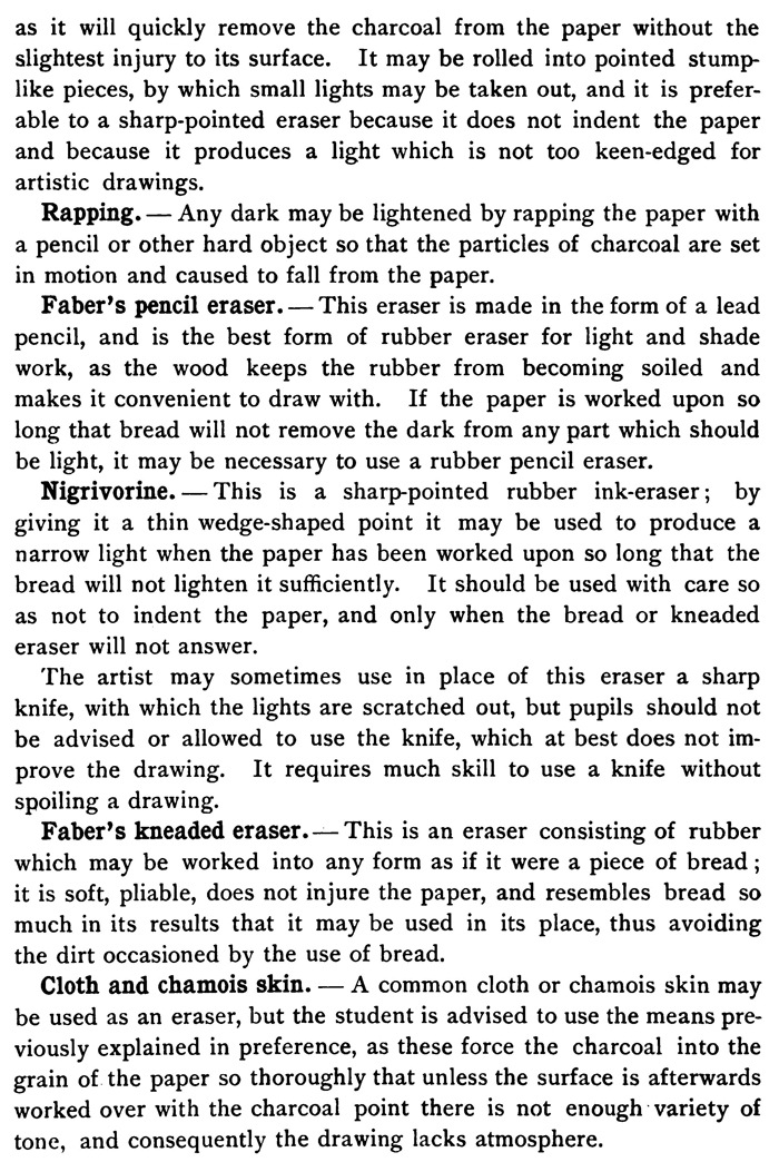 The finger. — When it is required to soften or lighten masses or any details not too small, the finger is the best eraser, but it cannot be used to obtain a very light detail within a mass of dark. The finger may be cleaned by rubbing it upon cloth or, better still, upon bread.