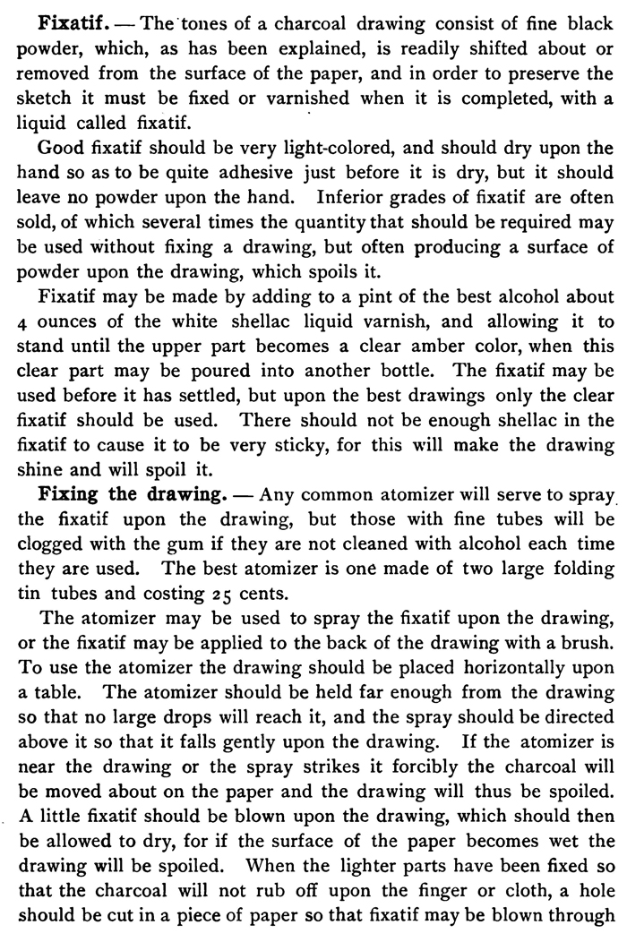 The tones of a charcoal drawing consist of fine black powder, which, as has been explained, is readily shifted about or removed from the surface of the paper, and in order to preserve the sketch it must be fixed or varnished when it is completed, with a liquid called fixatif. Good fixatif should be very light-colored, and should dry upon the hand so as to be quite adhesive just before it is dry, but it should leave no powder upon the hand. Inferior grades of fixatif are often sold, of which several times the quantity that should be required may be used without fixing a drawing, but often producing a surface of powder upon the drawing, which spoils it.