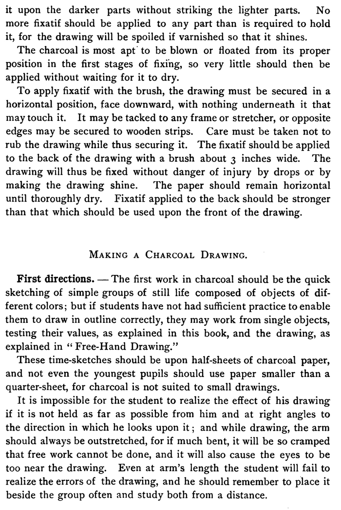 The charcoal is most apt to be blown or floated from its proper position in the first stages of fixing, so very little should then be applied without waiting for it to dry. To apply fixatif with the brush, the drawing must be secured in a horizontal position, face downward, with nothing underneath it that may touch it. It may be tacked to any frame or stretcher, or opposite edges may be secured to wooden strips. Care must be taken not to rub the drawing while thus securing it. The fixatif should be applied to the back of the drawing with a brush about 3 inches wide. The drawing will thus be fixed without danger of injury by drops or by making the drawing shine. The paper should remain horizontal until thoroughly dry. Fixatif applied to the back should be stronger than that which should be used upon the front of the drawing.