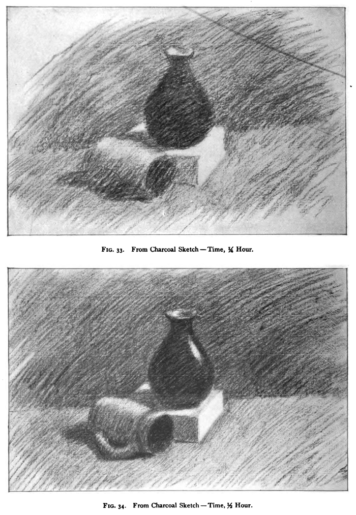 The second stage of the drawing is shown by Fig. 33, and is obtained by putting in the background and strengthening the darks to bring out the cast shadows. The student should not draw outlines or determine contours except as they come from gradually developing the forms of the masses of the different values. In doing this the charcoal should be carried over the objects across the contours and the background as often as possible, in order that sharp outlines may not destroy the effect of atmosphere, which comes from the contrast of tones only. The student should be able to produce the second stage of the rendering of a simple subject, such as Fig. 35, in not over fifteen minutes, for if he works slowly, he will be thinking of outlines and details instead of effects and masses : and if he begins thus, he will continue to work mechanically for the unimportant, without obtaining the essentials. Students have been so generally taught to make an outline drawing before beginning to shade that many find it very difficult not to think about outlines; but if they do not force themselves to cover the paper so as to suggest the principal masses, as in Fig. 33, in a few minutes, they will never be able to forget outlines and work freely and artistically.