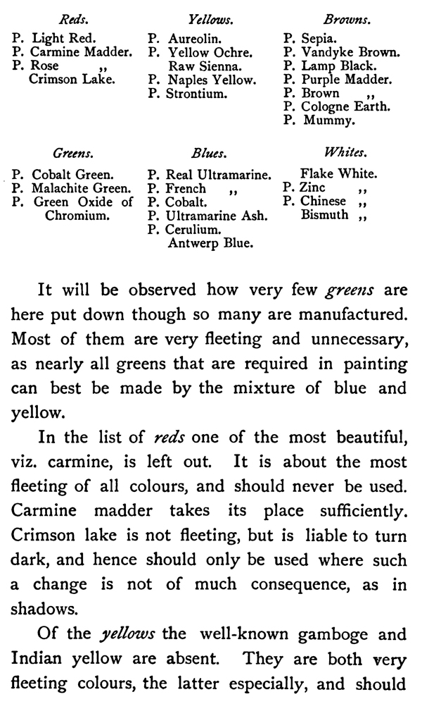 In the list of reds one of the most beautiful, viz. carmine, is left out. It is about the most fleeting of all colours, and should never be used. Carmine madder takes its place sufficiently. Crimson lake is not fleeting, but is liable to turn dark, and hence should only be used where such a change is not of much consequence, as in shadows.