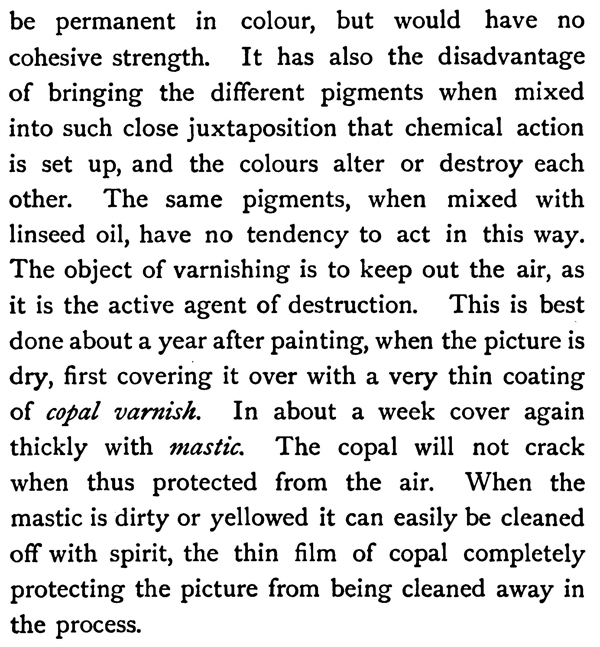 Of mediums, use as little as possible. It is necessary to rub some drying oil over a first painting before the second is applied, but it should always be cleaned off as much as possible. If we want to thin the colour for fine sable brushes, when putting in small branches of trees, foreground, rushes, etc., a little amber or copal varnish thinned with oil of lavender makes an excellent medium. This may be also used in those places where quick drying is required. Pure copal varnish is liable to crack, and mastic should not be employed except to varnish a picture after it is dry, as, if laid on before, it will rapidly make the picture turn yellow. In fact all mediums except turpentine have a tendency to turn oil-paintings yellow and finally brown or black through the oxidation of the air. Turpentine dries off completely, and if the pigments were ground with this instead of with oil they would be permanent in colour, but would have no cohesive strength. It has also the disadvantage of bringing the different pigments when mixed into such close juxtaposition that chemical action is set up, and the colours alter or destroy each other. The same pigments, when mixed with linseed oil, have no tendency to act in this way. The object of varnishing is to keep out the air, as it is the active agent of destruction. This is best done about a year after painting, when the picture is dry, first covering it over with a very thin coating of copal varnish. In about a week cover again thickly with mastic. The copal will not crack when thus protected from the air. When the mastic is dirty or yellowed it can easily be cleaned off with spirit, the thin film of copal completely protecting the picture from being cleaned away in the process.