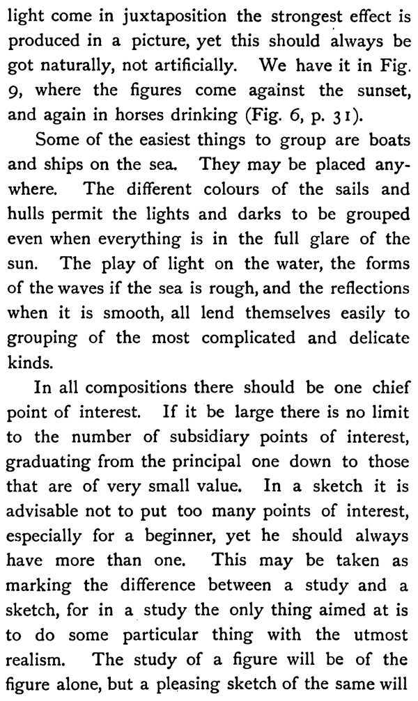 Some of the easiest things to group are boats and ships on the sea. They may be placed anywhere. The different colours of the sails and hulls permit the lights and darks to be grouped even when everything is in the full glare of the sun. The play of light on the water, the forms of the waves if the sea is rough, and the reflections when it is smooth, all lend themselves easily to grouping of the most complicated and delicate kinds.