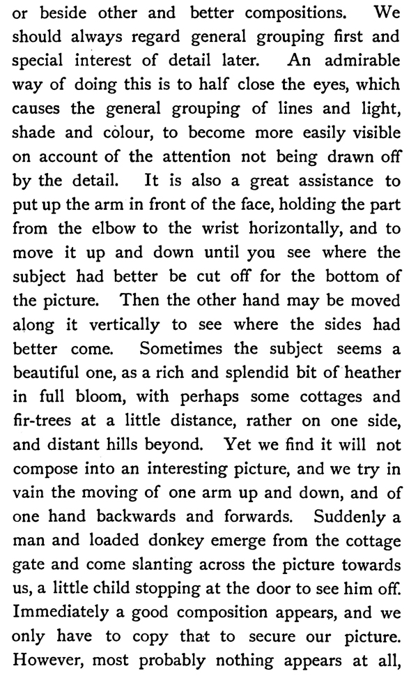 Selection of a Subject—It is strange what a long time it takes before the beginner can learn to choose a subject that composes well. Details attract him too much, such as a splendidly rugged trunk, a beautiful group of flowers, a charming reflection, or a most rustic cottage, which one and all rivet his attention regardless of surroundings, and he is surprised when his sketch is done how poor and uninteresting it looks if put upon a wall or beside other and better compositions. We should always regard general grouping first and special interest of detail later. An admirable way of doing this is to half close the eyes, which causes the general grouping of lines and light, shade and colour, to become more easily visible on account of the attention not being drawn off by the detail. It is also a great assistance to put up the arm in front of the face, holding the part from the elbow to the wrist horizontally, and to move it up and down until you see where the subject had better be cut off for the bottom of the picture. Then the other hand may be moved along it vertically to see where the sides had better come. Sometimes the subject seems a beautiful one, as a rich and splendid bit of heather in full bloom, with perhaps some cottages and fir-trees at a little distance, rather on one side, and distant hills beyond. Yet we find it will not compose into an interesting picture, and we try in vain the moving of one arm up and down, and of one hand backwards and forwards. Suddenly a man and loaded donkey emerge from the cottage gate and come slanting across the picture towards us, a little child stopping at the door to see him off.