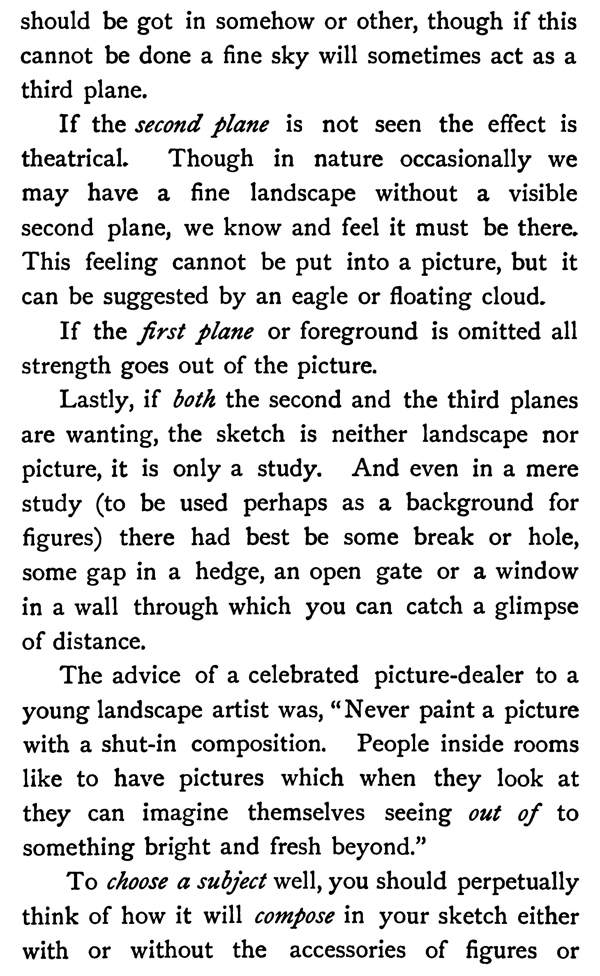 Lastly, if both the second and the third planes are wanting, the sketch is neither landscape nor picture, it is only a study. And even in a mere study (to be used perhaps as a background for figures) there had best be some break or hole, some gap in a hedge, an open gate or a window in a wall through which you can catch a glimpse of distance.