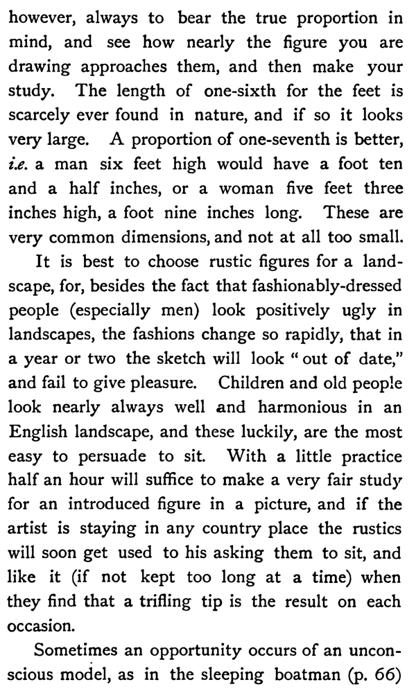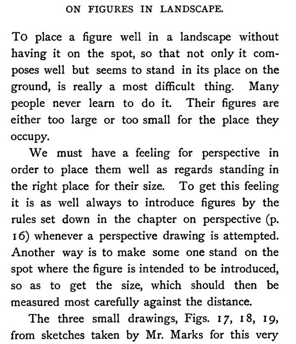 To place a figure well in a landscape without having it on the spot, so that not only it composes well but seems to stand in its place on the ground, is really a most difficult thing. Many people never learn to do it. Their figures are either too large or too small for the place they occupy.
