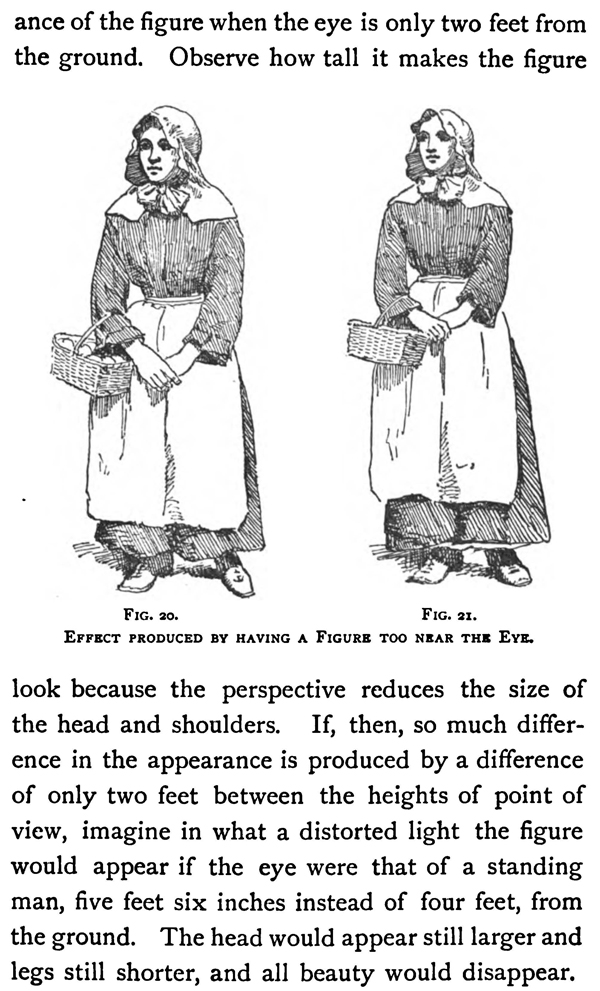 look because the perspective reduces the size of the head and shoulders. If, then, so much difference in the appearance is produced by a difference of only two feet between the heights of point of view, imagine in what a distorted light the figure would appear if the eye were that of a standing man, five feet six inches instead of four feet, from the ground. The head would appear still larger and legs still shorter, and all beauty would disappear.