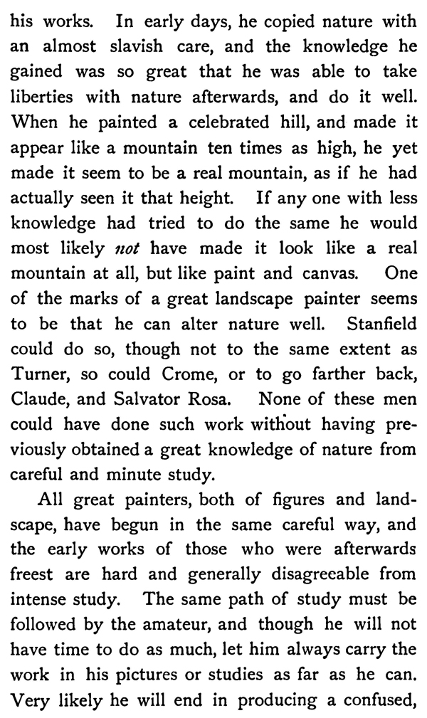 When he painted a celebrated hill, and made it appear like a mountain ten times as high, he yet made it seem to be a real mountain, as if he had actually seen it that height. If any one with less knowledge had tried to do the same he would most likely not have made it look like a real mountain at all, but like paint and canvas. One of the marks of a great landscape painter seems to be that he can alter nature well. Stanfield could do so, though not to the same extent as Turner, so could Crome, or to go farther back, Claude, and Salvator Rosa. None of these men could have done such work without having previously obtained a great knowledge of nature from careful and minute study.