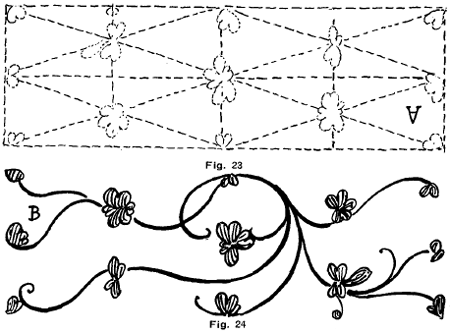 A Wall-Paper Design The casual observer would not be apt to guess that the design in Fig. 24 was based on the dotted line units in A, Fig. 23, placed in their regular order, aided by the oblique, horizontal and vertical lines of the diagram. Yet that is the man Tier in which the design is made. It will be interesting to see how readily the design B may be copied by resorting to the method of duplicating a drawing as shown in the chapter on Triangulation.