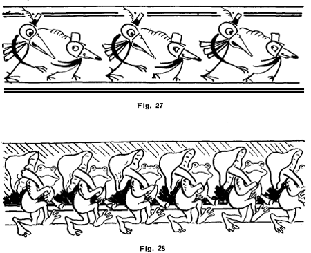 The comic figures in Figs. 27 and 28 are given importance as a border design simply by being repeated.