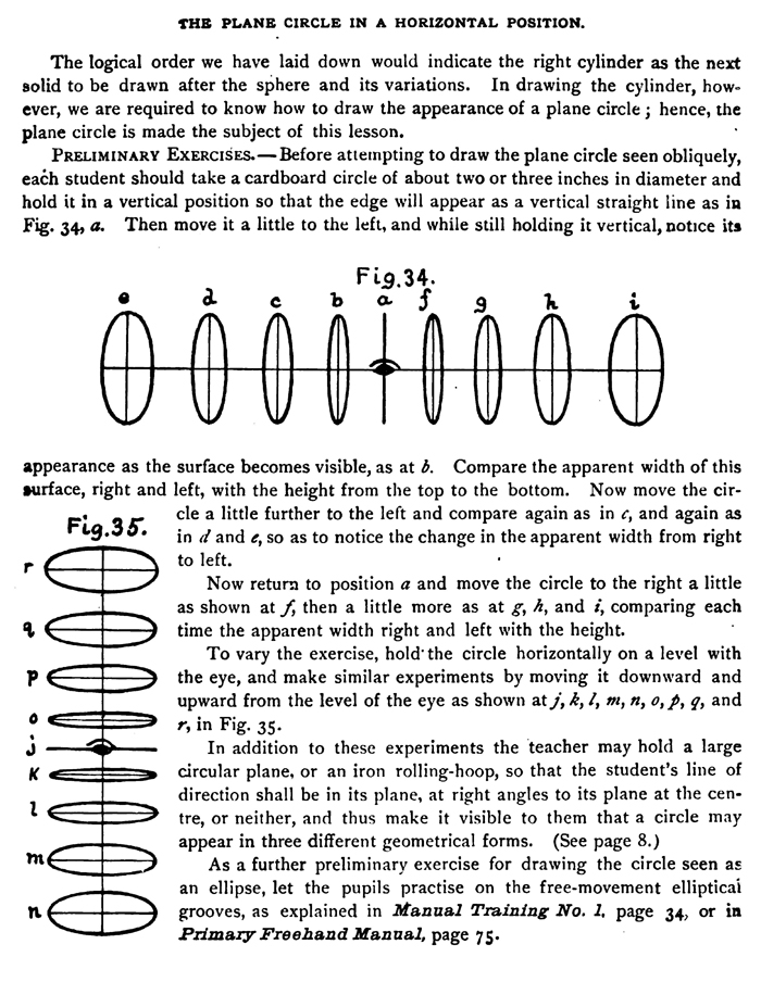 The logical order we have laid down would indicate the right cylinder as the next solid to be drawn after the sphere and its variations. In drawing the cylinder, however, we are required to know how to draw the appearance of a plane circle ; hence, the plane circle is made the subject of this lesson.