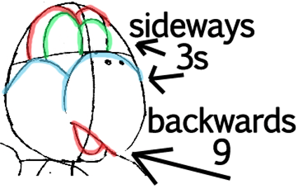Draw 3 sideways number 3s on top of the head and draw a sideways number ‘9’ at the bottom of his head for his beak / mouth.