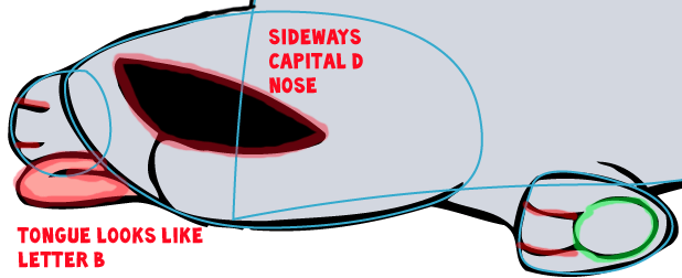 Draw the dog’s tongue that looks like a letter ‘B” shape and draw a capital ‘D’ shape nose. Then draw his left paw inside the left small oval by drawing two lines and draw his right paw in the left triangle with rounded corners by drawing two lines and an oval. Draw the outline of the dog as shown in the illustration above.