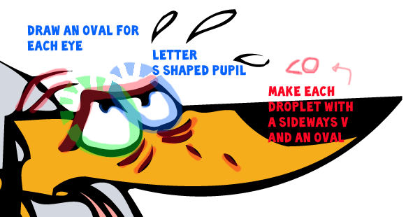 Draw an oval for each eye and a letter ‘S’ shapes for he pupils. Make each droplet with a sideways ‘V’ shape and an oval.