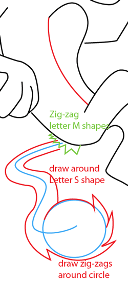 For his tail, start by drawing a backwards number ‘3’ shape and a circle. For his foot, a number ‘2’ shape and two sideways number ‘3’ shapes.