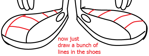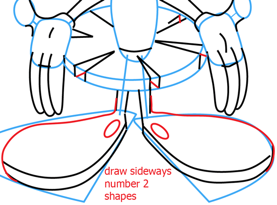 Draw sideways number ‘2’ shapes and two ovals in each shoe.
