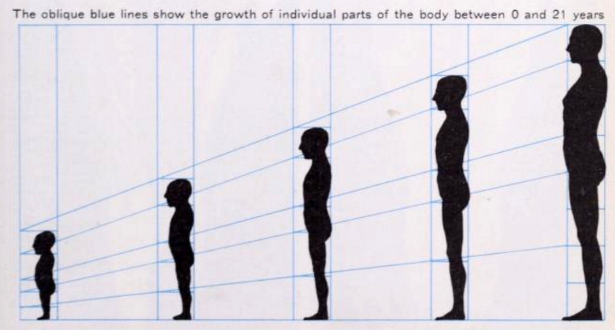 Sport and Human Anatomy usual for girls as for boys, and thus girls, too, develop their muscles at the expense of the fat tissues. Some medical opinion attributes a tendency to greater stature directly to the influence of sunlight on the body, particularly in early childhood. It can be seen from the diagram of physical growth from birth to maturity how different ports of the body grow at different rates. In linear measurement the head, for example, only increases from between a half and a third, whereas the shin is four times as long in a man as in a newborn baby. All the other parts of the body increase in different proportions within these extremes.
