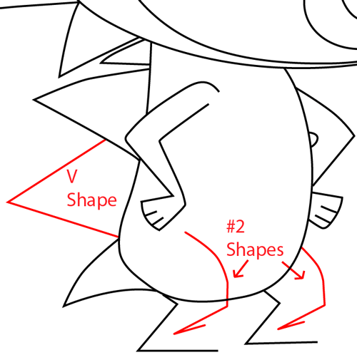 Draw a letter ‘V’ shape to complete the spikes on the back. Next continue the feet by drawing number ‘2’ shapes.