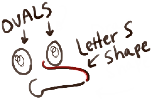 Draw ovals for eyes and a sideways ?-like shape for the nose.
