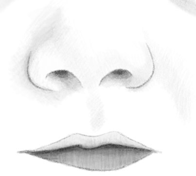 Shade the lighter tones of the nose. Shade the divot below the nose. Draw lines to the lips and continue shading them.